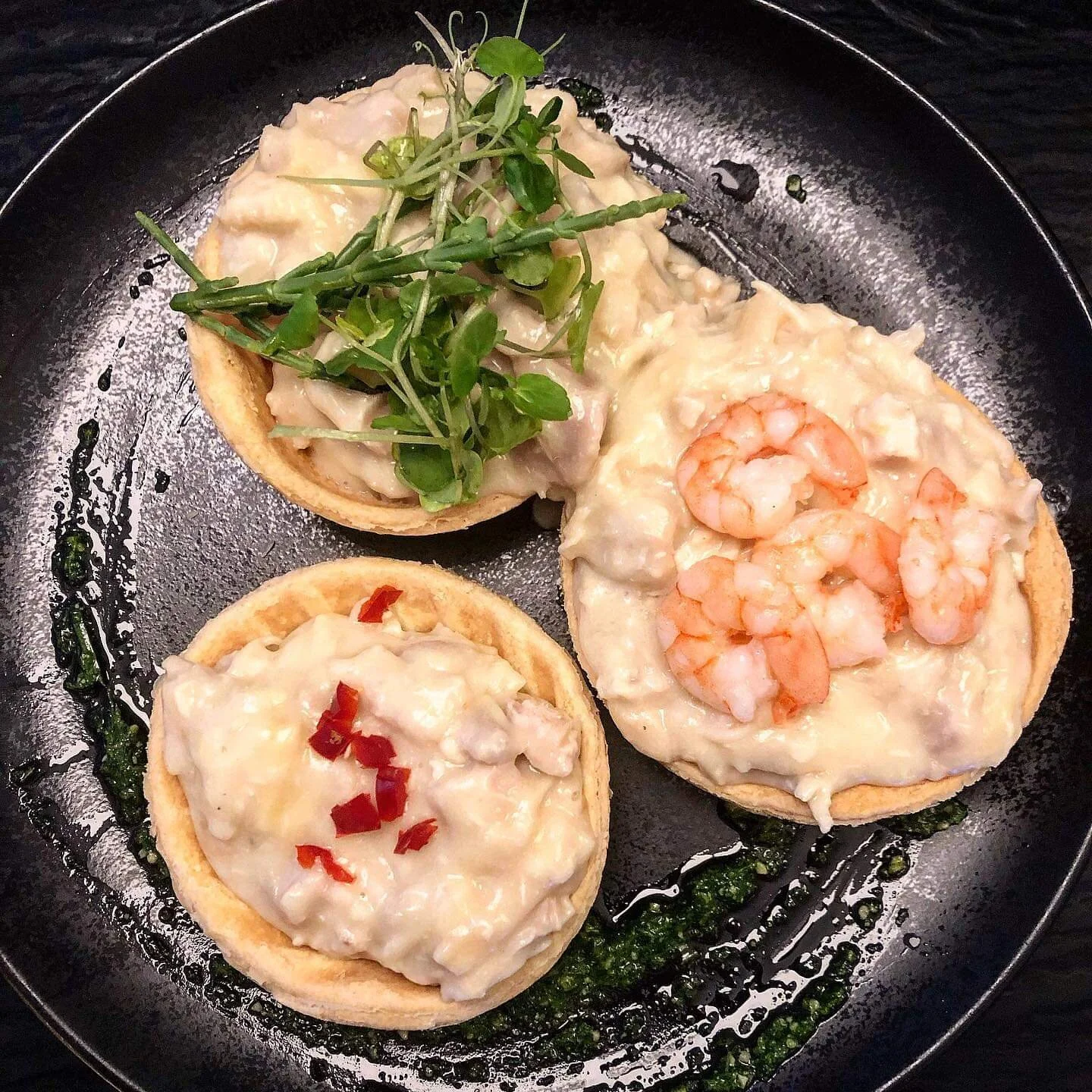 Marinerede tigerrejer toppet med frisk mango